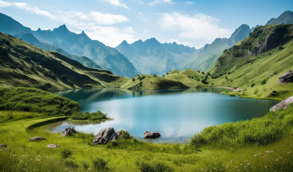 Назад к обои зелень, лето, трава, облака, пейзаж, горы, природа, озеро