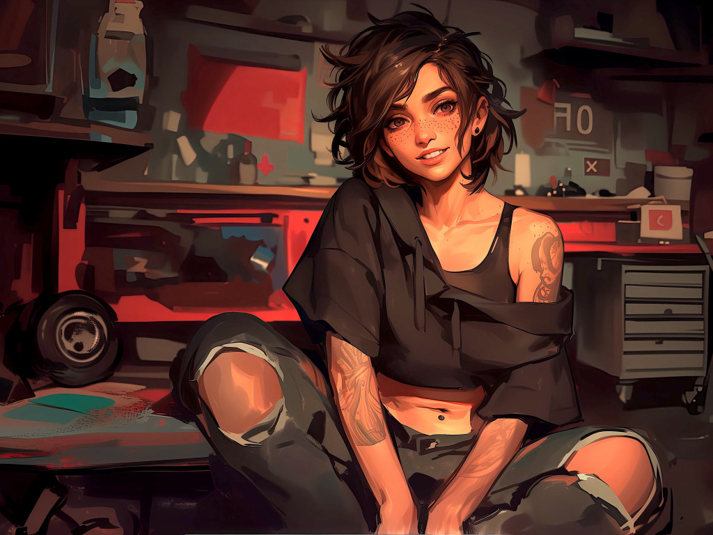 girl, brown eyes, tattoo, brunette, digital art, artwork, table, situation