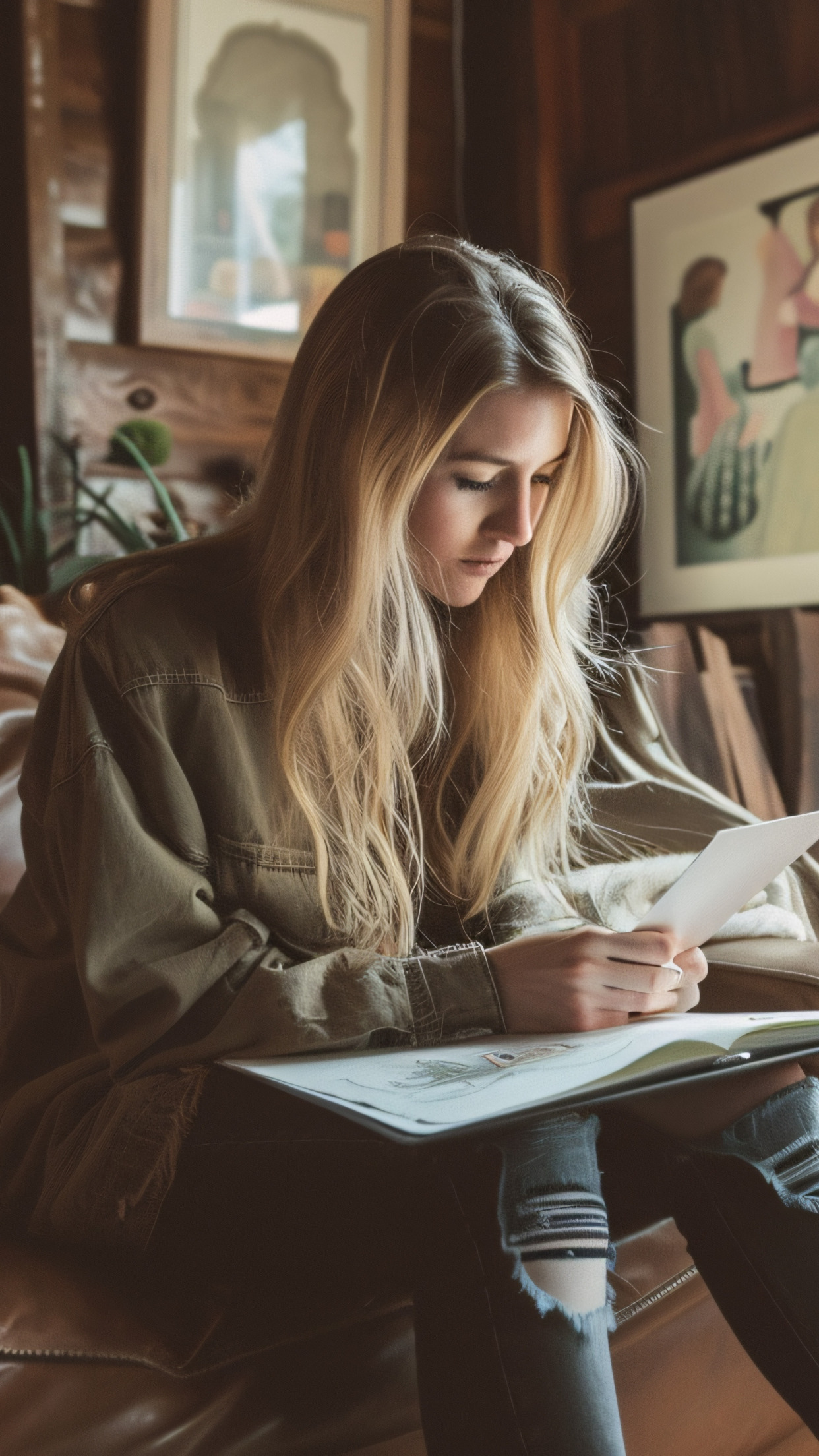 девушка, комната, диван, дома, блондинка, книга, журнал, сидит