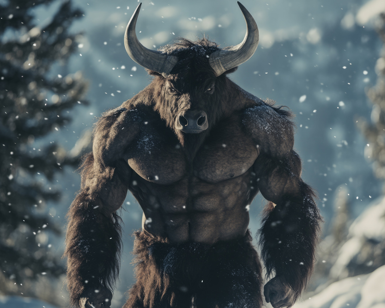 Назад к обои зима, взгляд, снег, деревья, рога, чудовище, минотавр, цифровое искусство