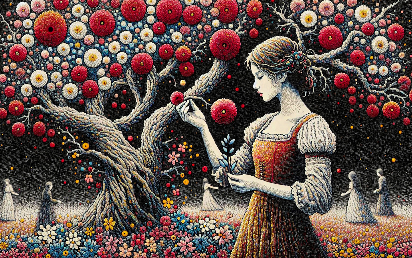 Назад к обои девушка, деревья, цветы, ретро, темный фон, человек, стилизация, сад