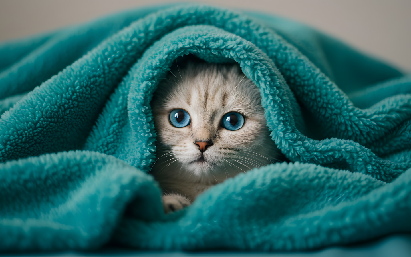 Назад к обои кошка, взгляд, поза, уют, лежит, плед, котёнок, голубые глаза