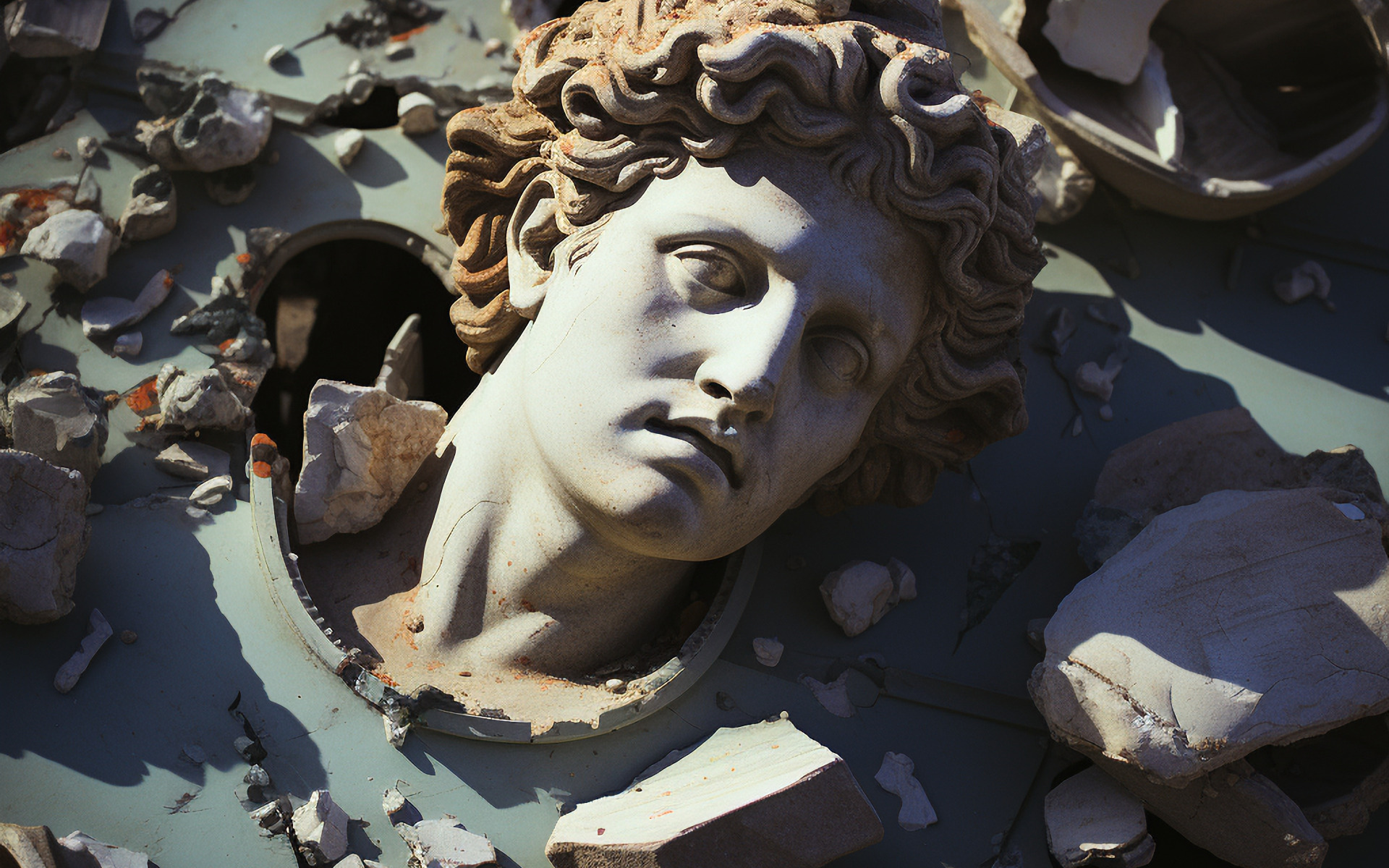 осколки, голова, мужчина, скульптура, бюст, разбитое, цифровое искусство, ИИ-арт