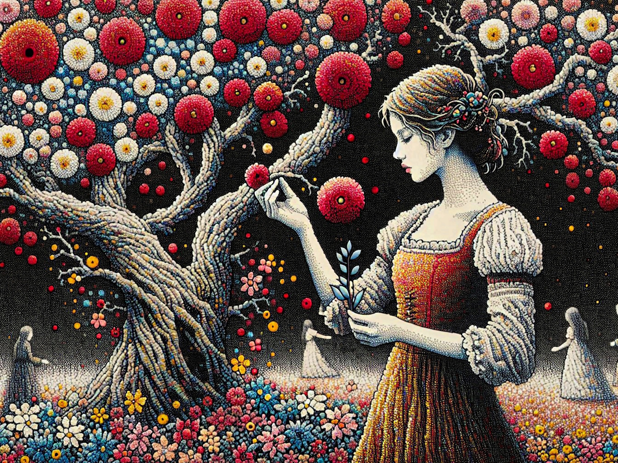 Назад к обои девушка, деревья, цветы, ретро, темный фон, человек, стилизация, сад