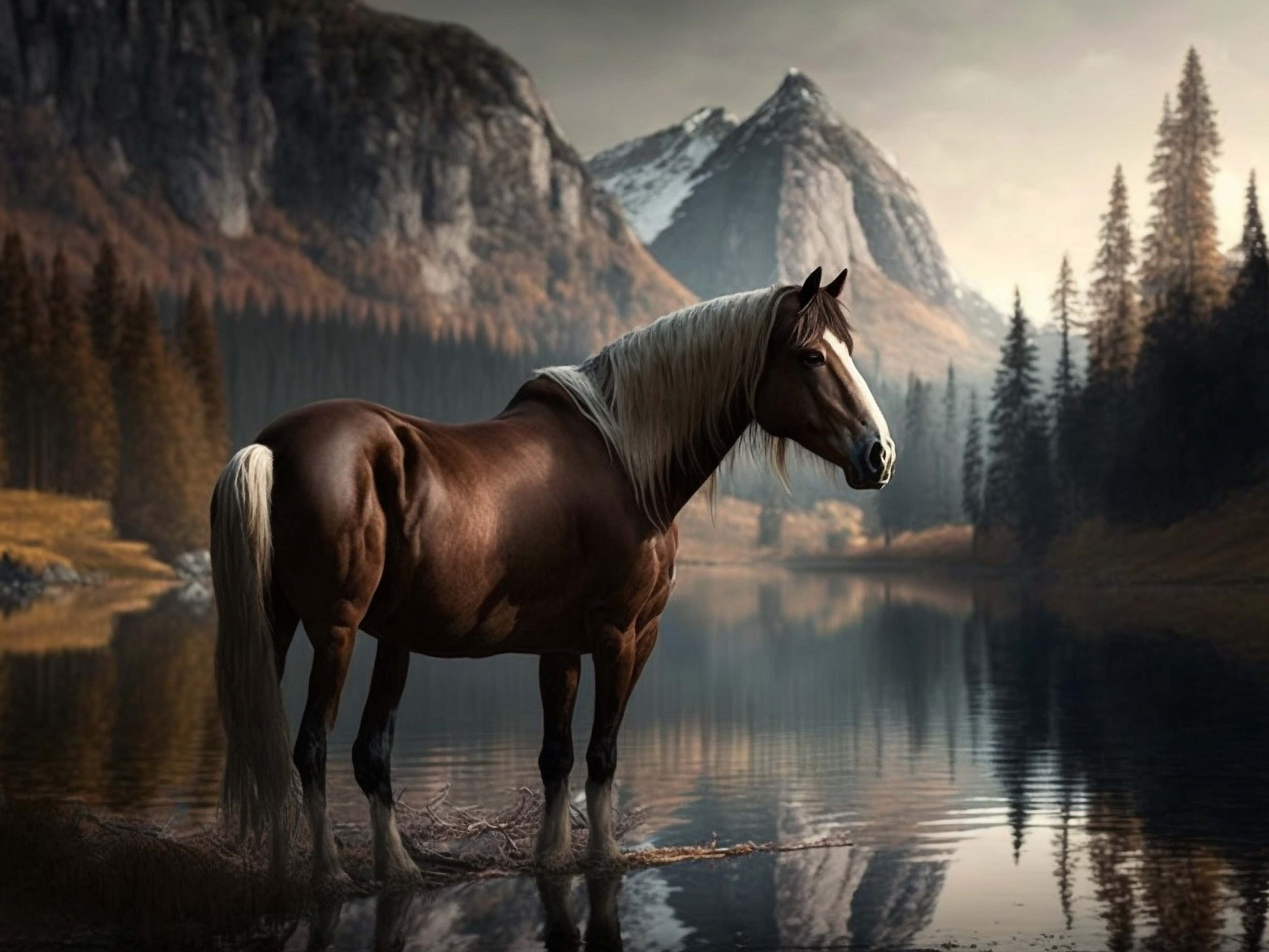 Назад к обои лес, пейзаж, горы, природа, конь, берег, лошадь, графика