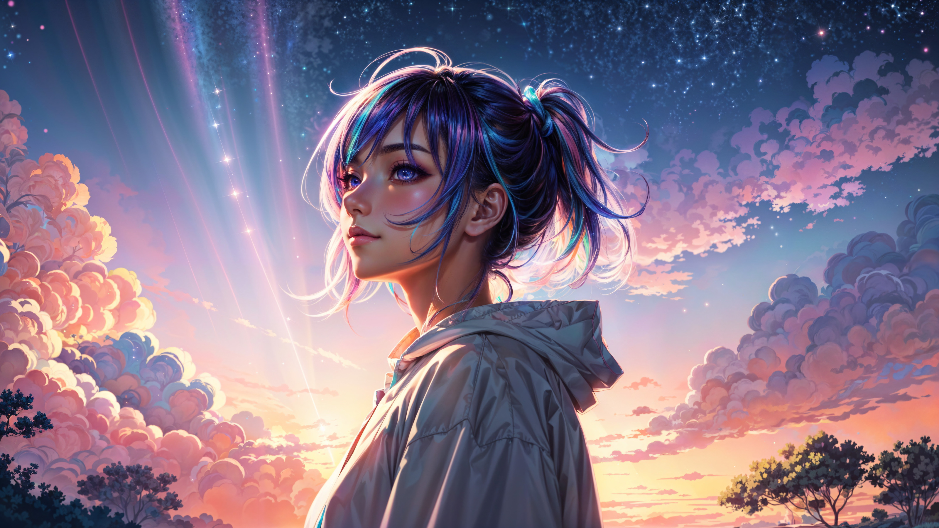 Назад к обои небо, облака, свет, портрет, лучи солнца, голубые волосы, красивая девушка, на природе
