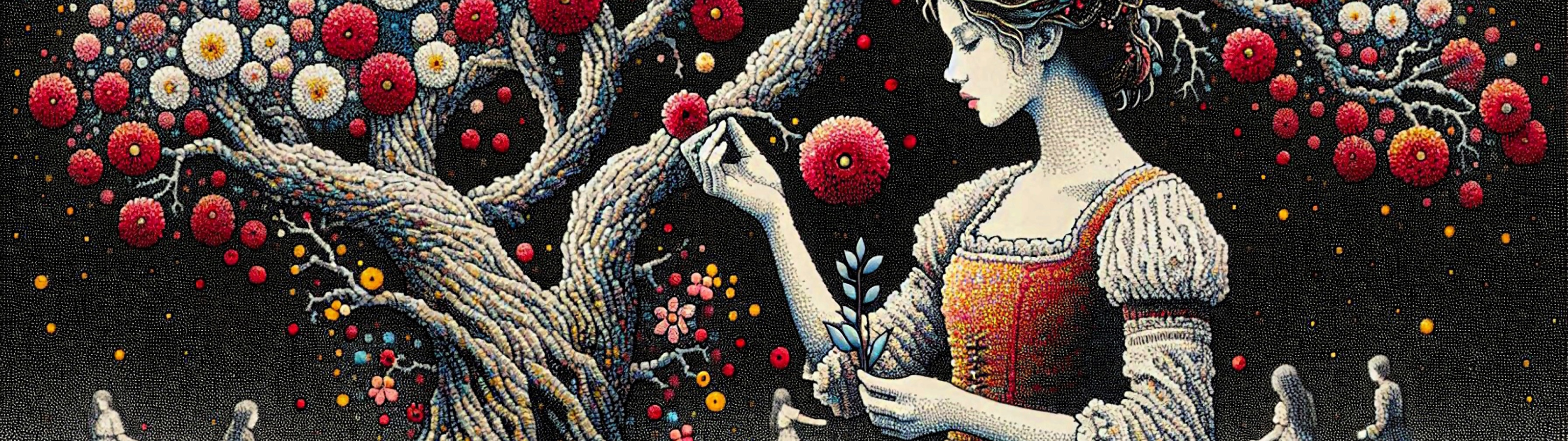 Назад к обои девушка, деревья, цветы, ретро, темный фон, человек, стилизация, сад