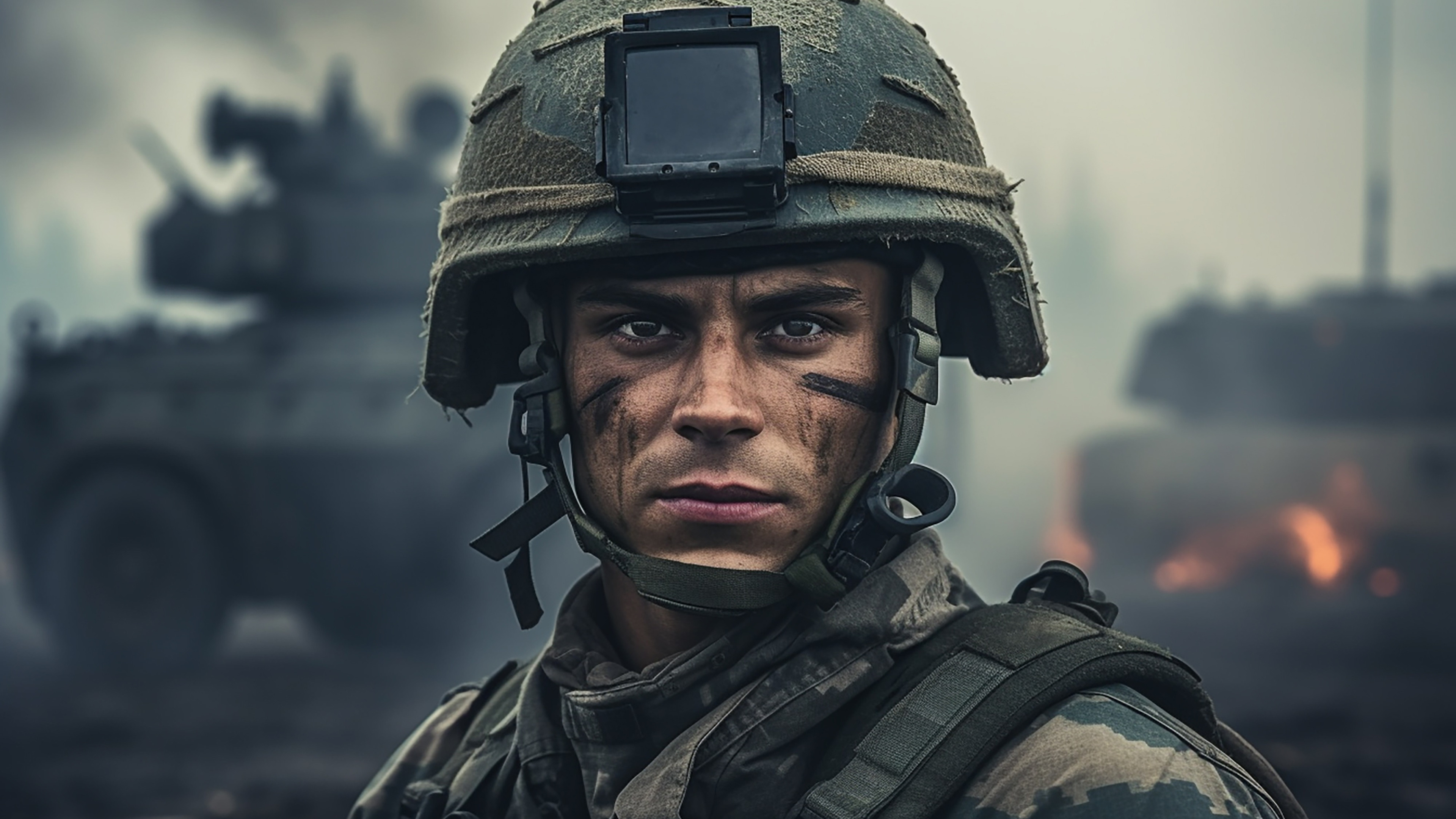 взгляд, солдат, мужчина, экипировка, каска, цифровое искусство, ИИ-арт, Искусство искусственного интеллекта