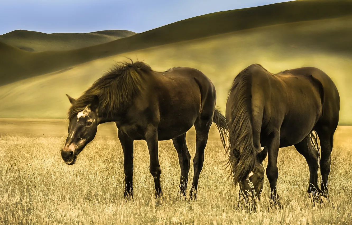 Трава, холмы, лошадь, луг обои на телефон (фото, картинки)