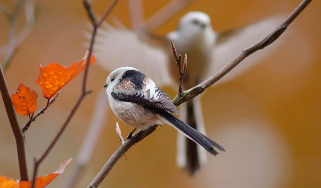 Назад к обои осень, листья, ветки, птица, боке, синица, длиннохвостые синицы