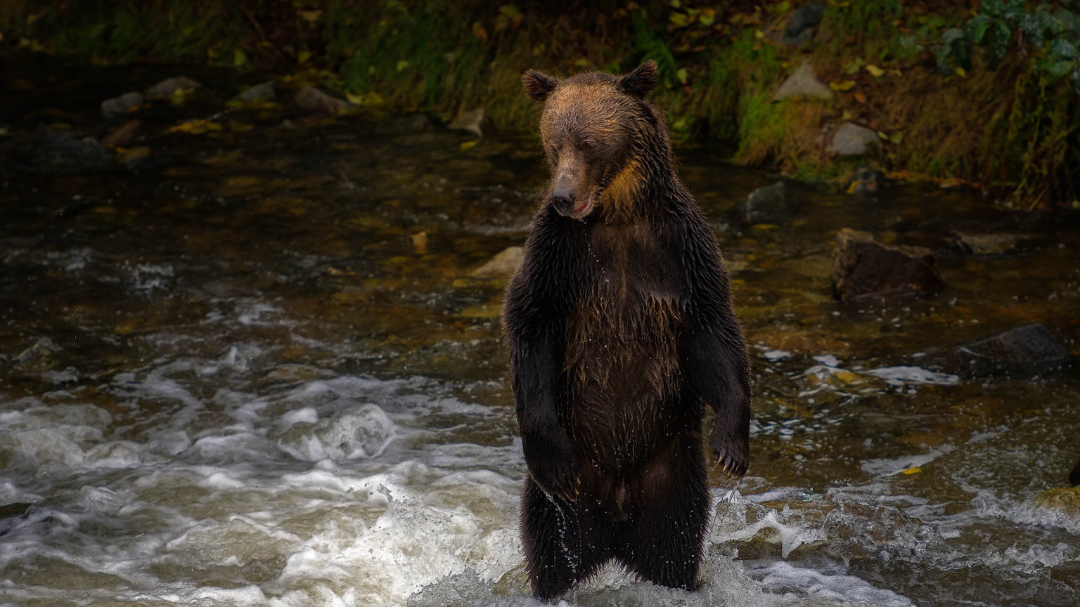 Назад к обои поза, река, камни, берег, течение, мокрая, медведь, купание