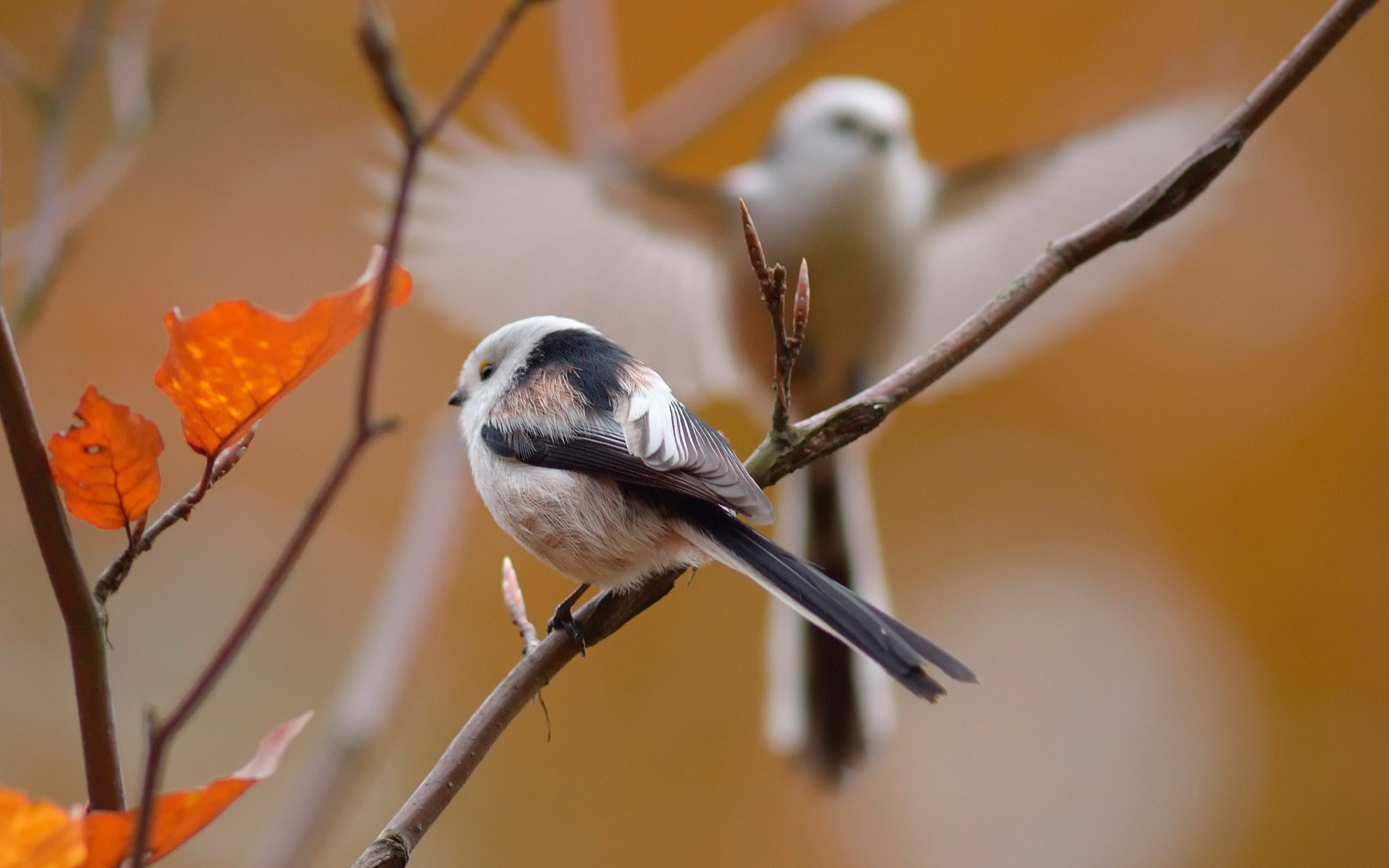 Назад к обои осень, листья, ветки, птица, боке, синица, длиннохвостые синицы