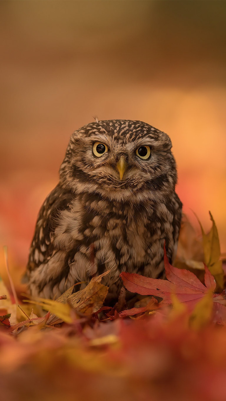 Назад к обои осень, сова, птица, боке, опавшие листья, совенок, Домовый сыч