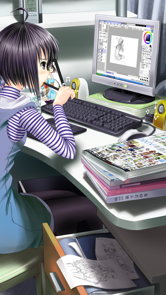 компьютер, комната, рисунок, карандаши, арт, девочка, silversirius