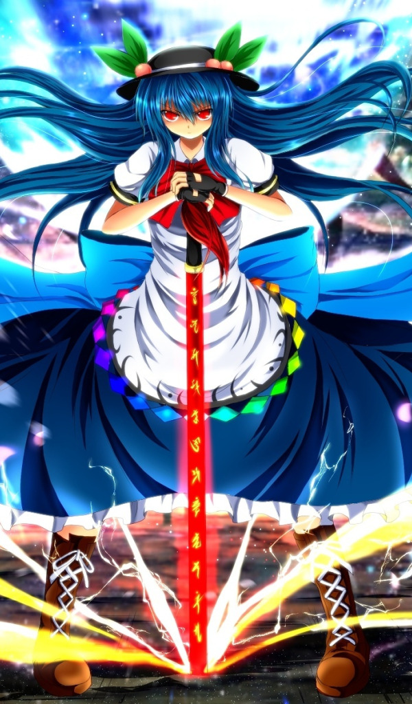 Назад к обои взгляд, девушка, оружие, злость, молния, Hinanawi Tenshi, touhou, art