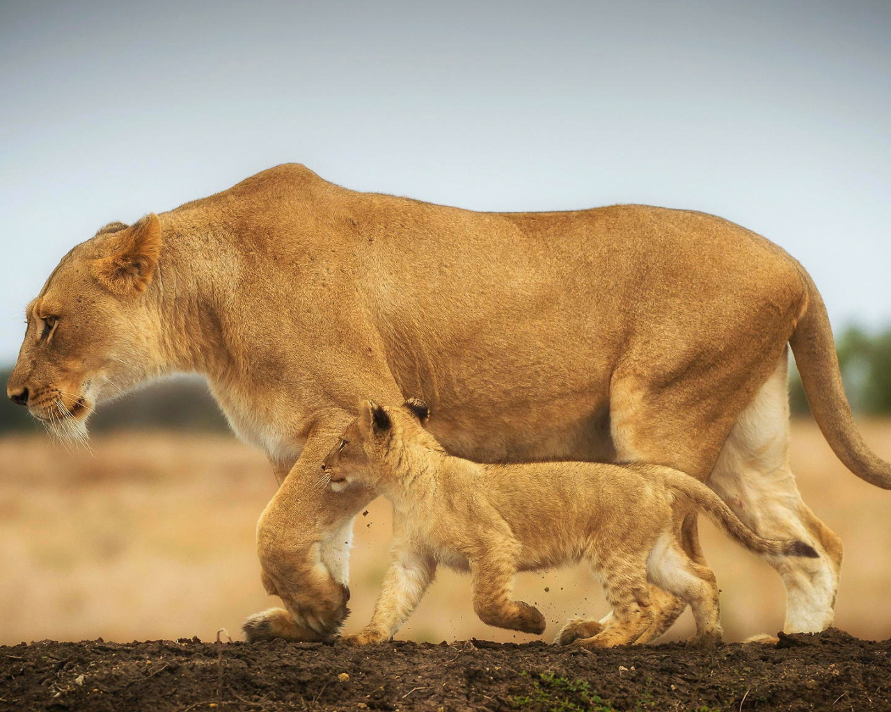 Назад к обои прогулка, львица, львёнок, большие кошки