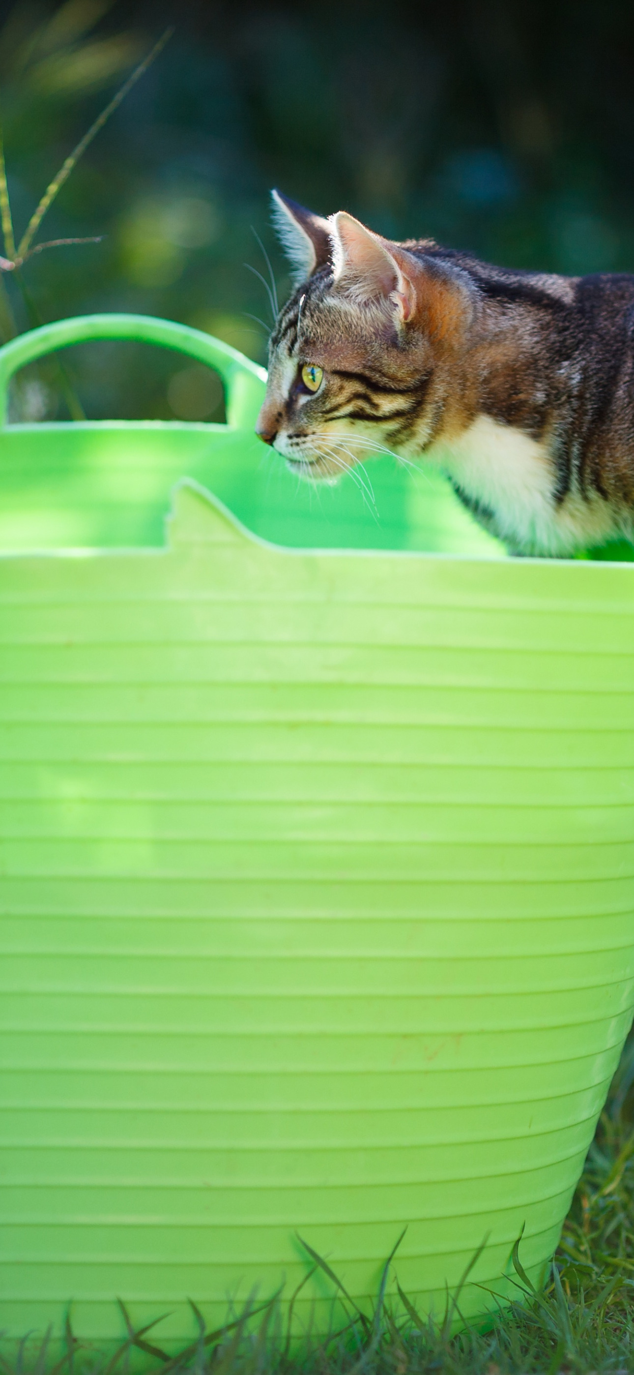 Назад к обои кошка, поза, корзина, игра, сад, котёнок, таз