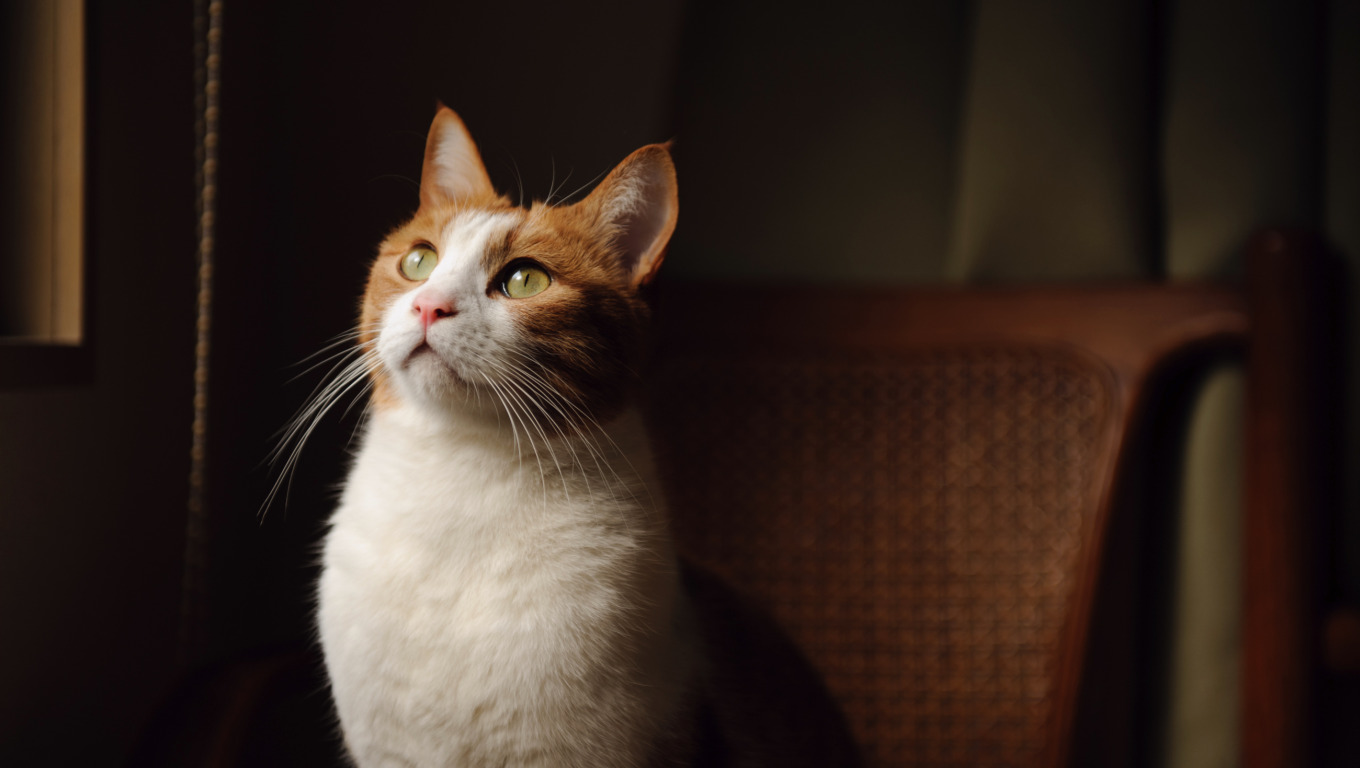 кот, взгляд, кресло, окрас, зеленые глаза, бело-рыжая