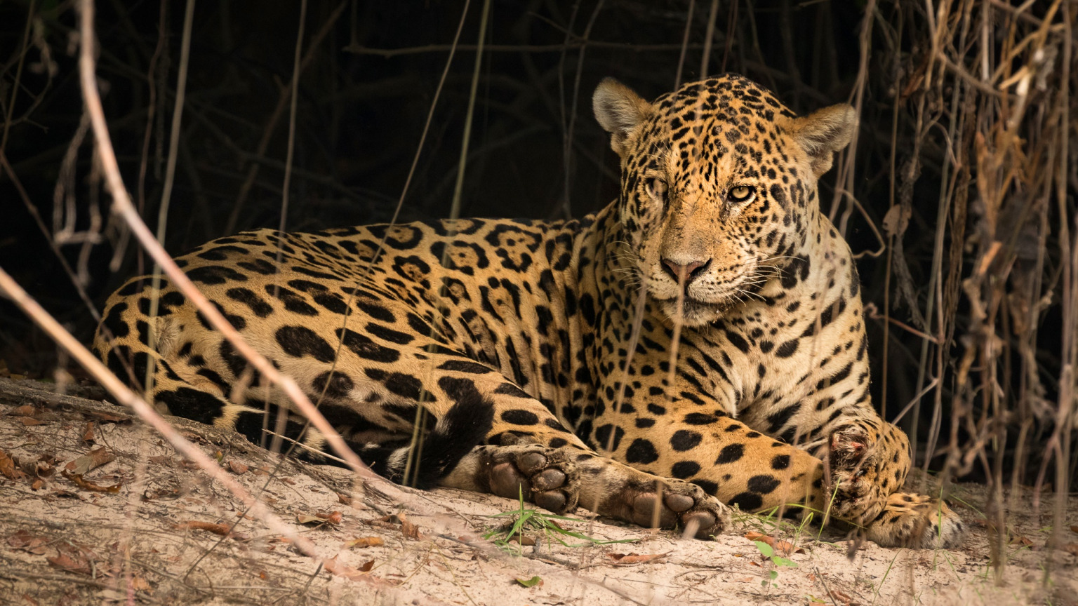 взгляд, морда, поза, темный фон, отдых, стебель, лежит, ягуар
