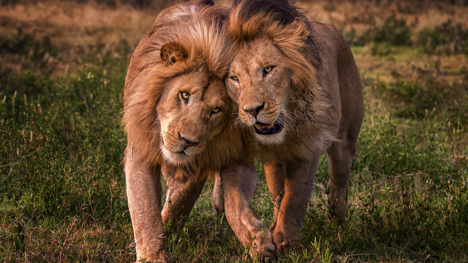 Назад к обои поле, морда, друг, лев, пара, прогулка, два льва