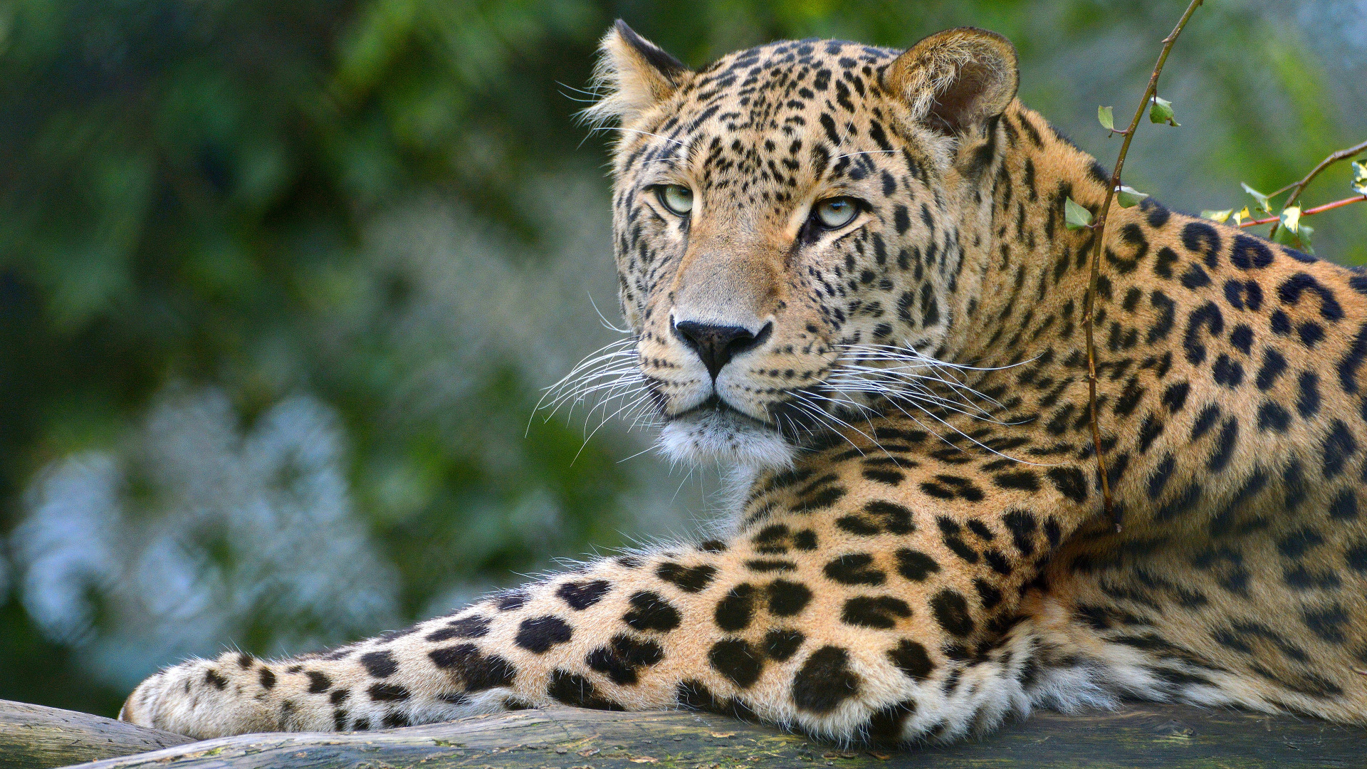 Назад к обои кошка, взгляд, морда, ветки, фон, лапы, леопард, лежит