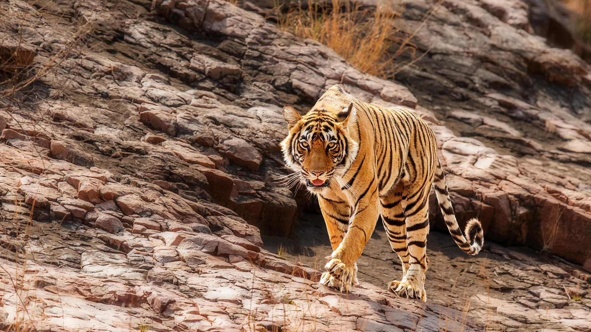 взгляд, тигр, скалы, склон, прогулка, крадется