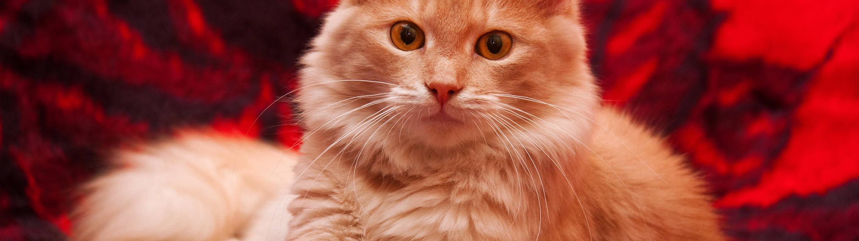 Назад к обои кошка, кот, взгляд, красный, фон, пушистый, покрывало, лежит