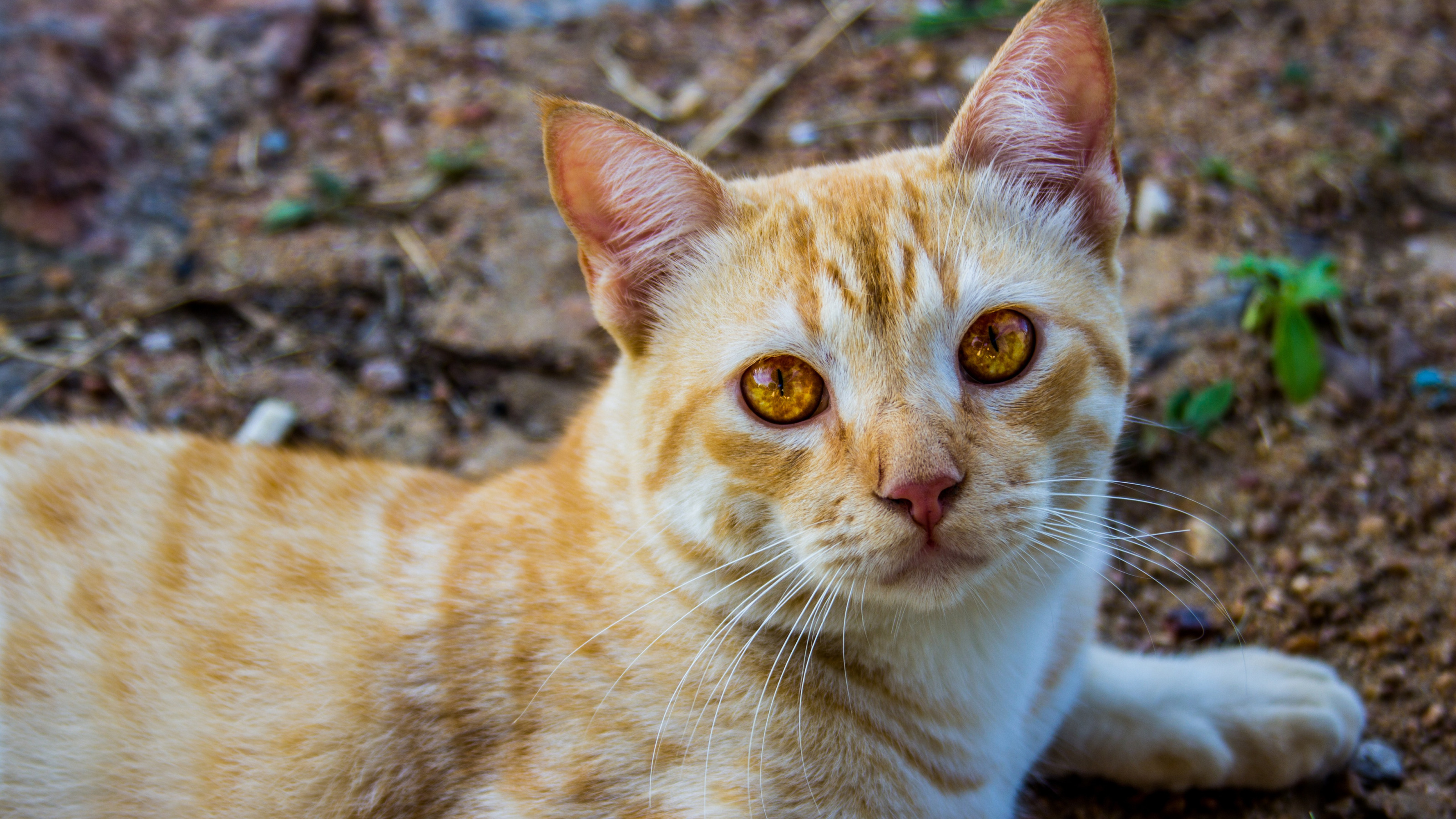кошка, кот, взгляд, морда, земля, котик, лежит, рыжая