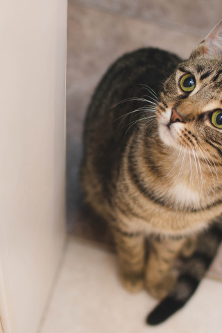 Назад к обои кошка, кот, взгляд, серый, фон, пол, сидит, полосатый
