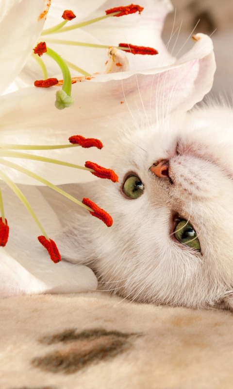 Назад к обои кошка, белый, взгляд, цветы, поза, пыльца, лилии, малыш