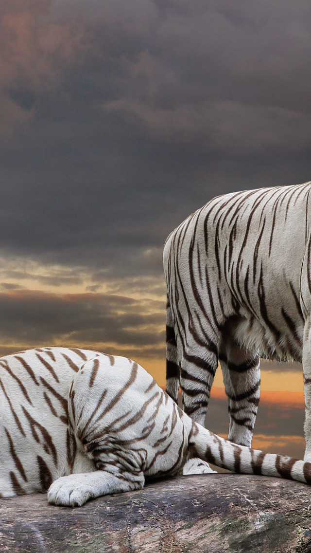 Назад к обои белый, небо, взгляд, закат, тучи, тигр, поза, камни