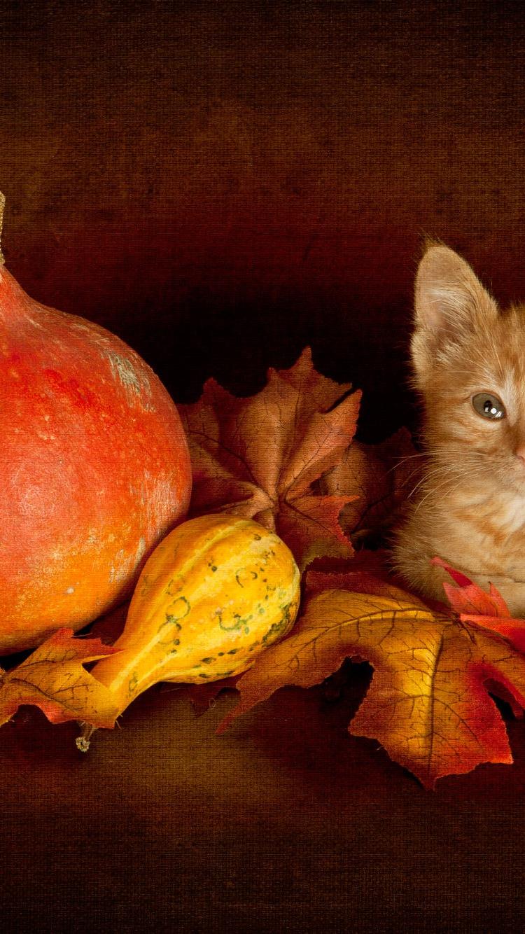Назад к обои осень, кошка, взгляд, листья, поза, темный фон, урожай, малыш