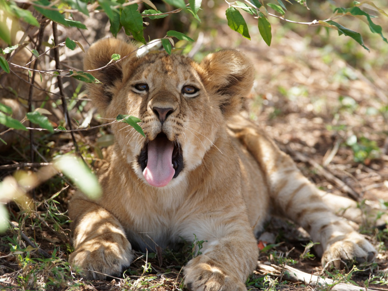 Назад к обои язык, трава, взгляд, ветки, отдых, тень, лев, детёныш