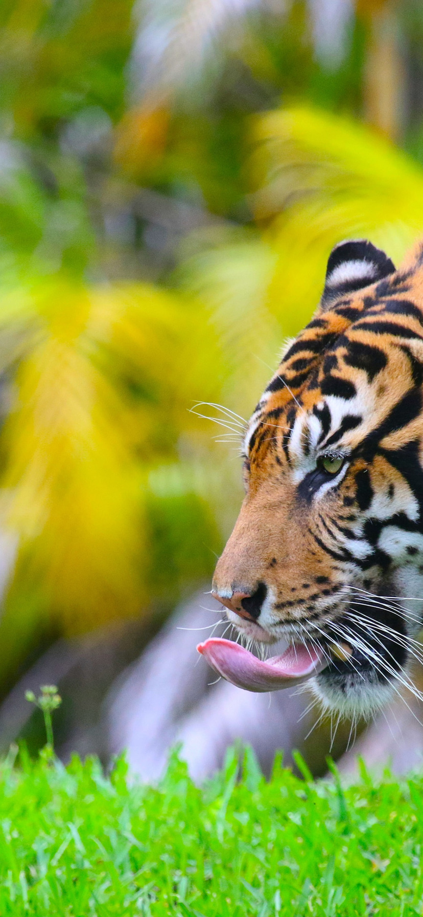 Назад к обои зелень, язык, трава, морда, листья, тигр, поляна, профиль