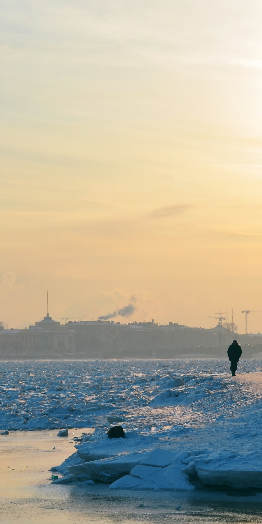 лед, зима, солнце, снег, закат, город, река, одиночество