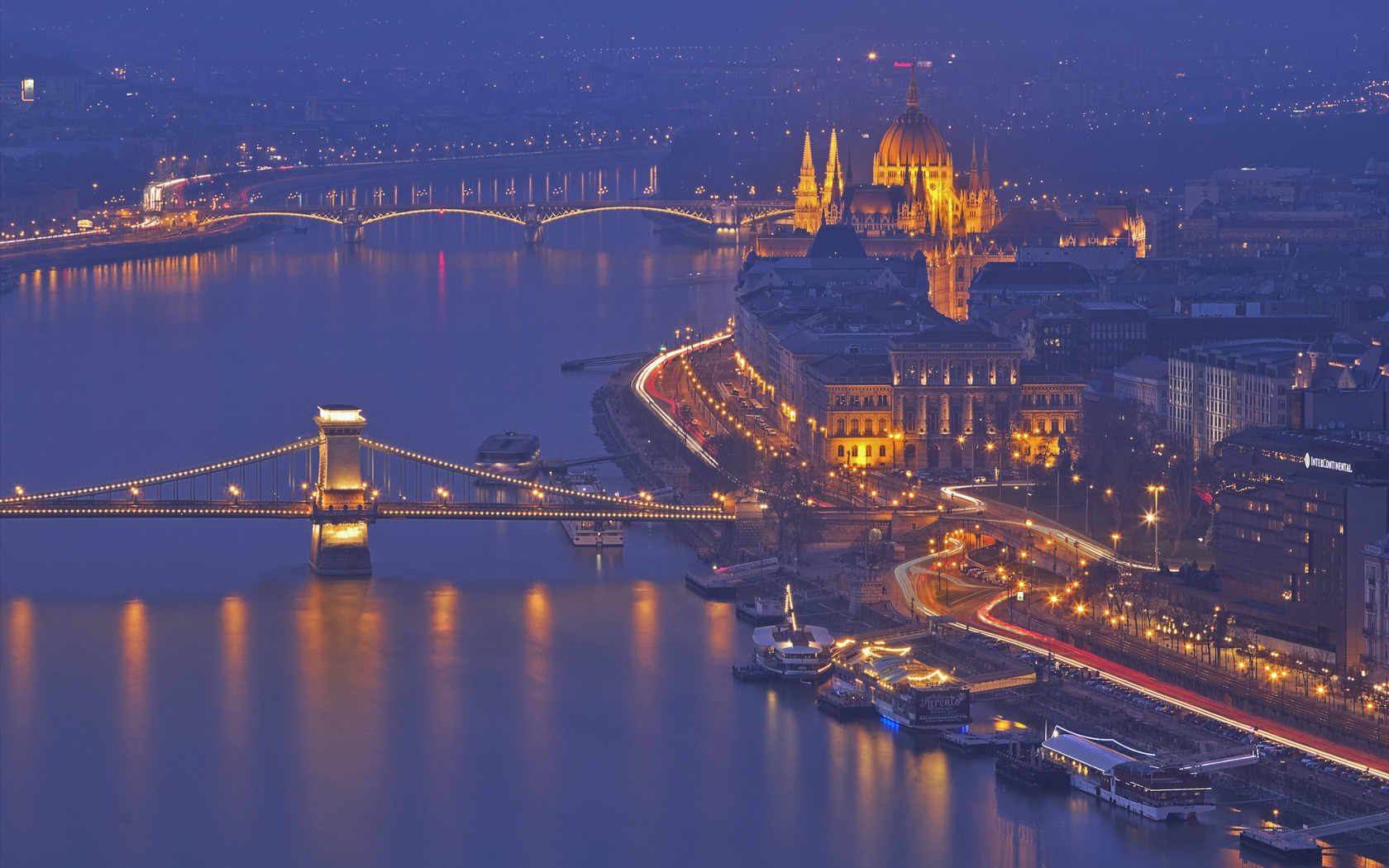 Назад к обои ночь, огни, река, парламент, Венгрия, Будапешт, Дунай, Цепной мост