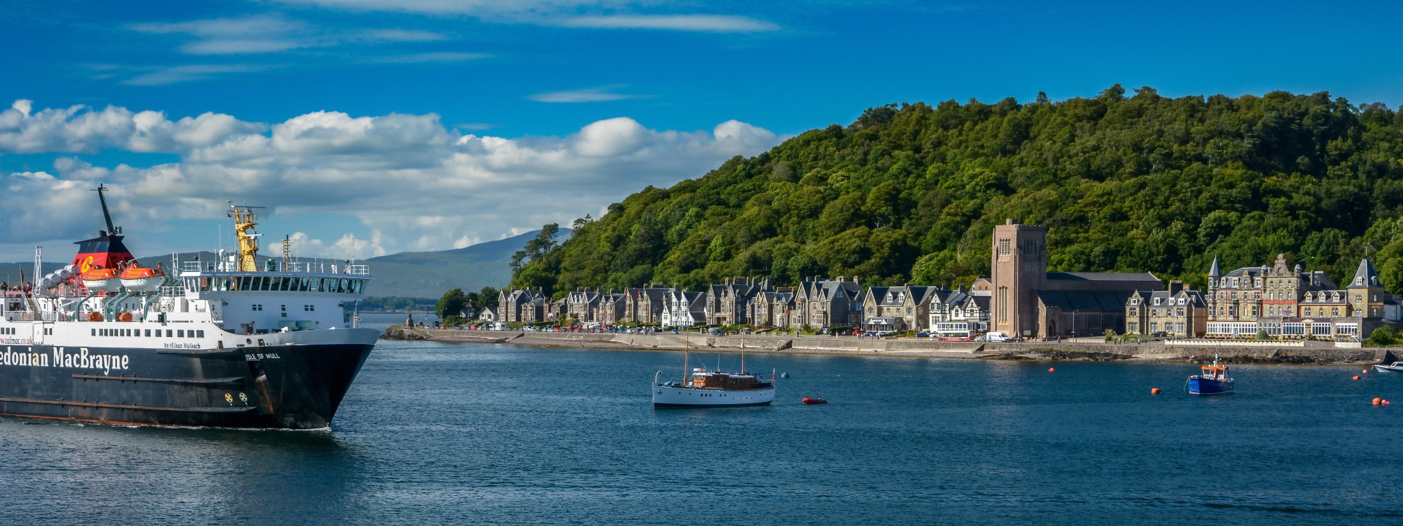 корабль, здания, дома, Шотландия, панорама, городок, паром, набережная
