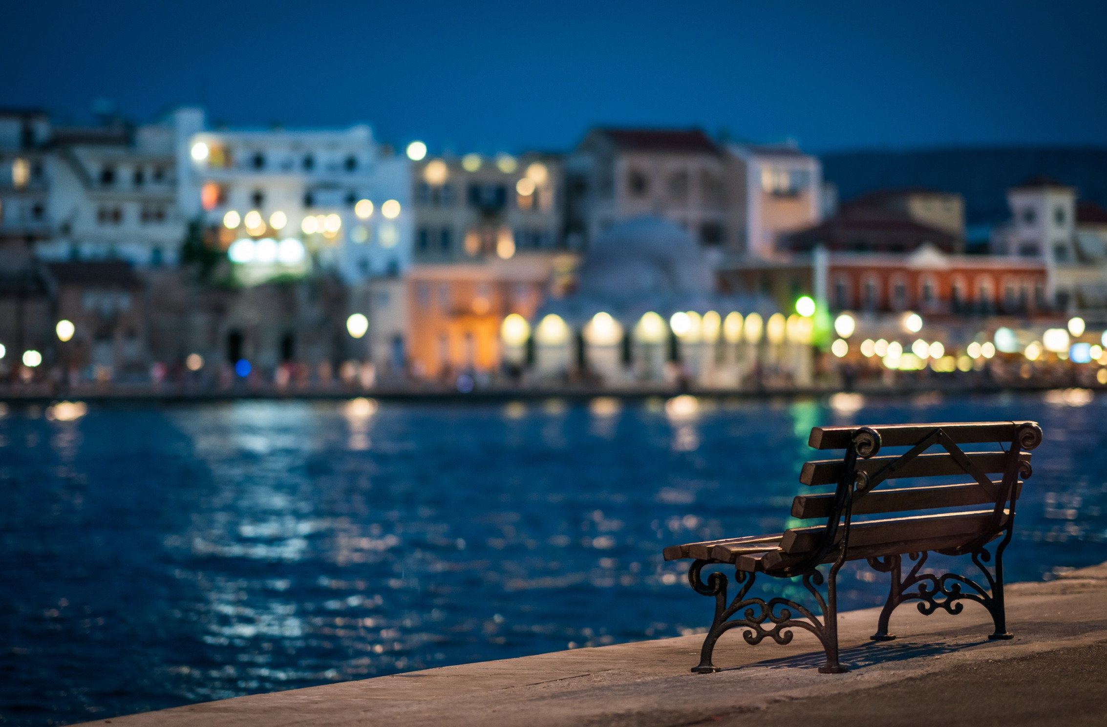 Назад к обои город, огни, река, вечер, набережная, скамья