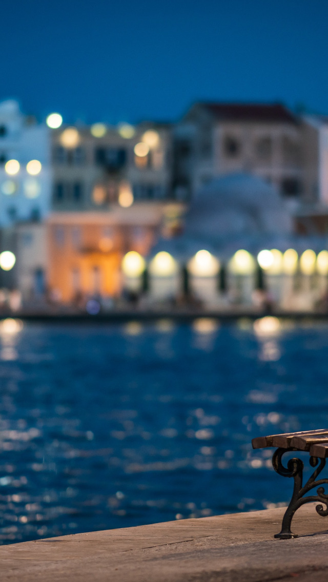 Назад к обои город, огни, река, вечер, набережная, скамья