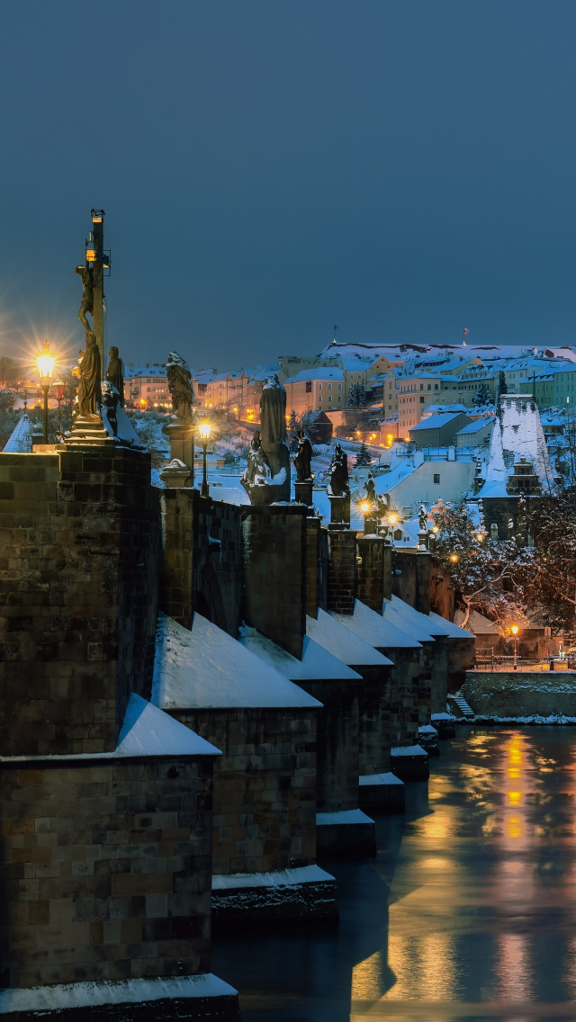 Назад к обои зима, снег, мост, река, здания, дома, Прага, Чехия
