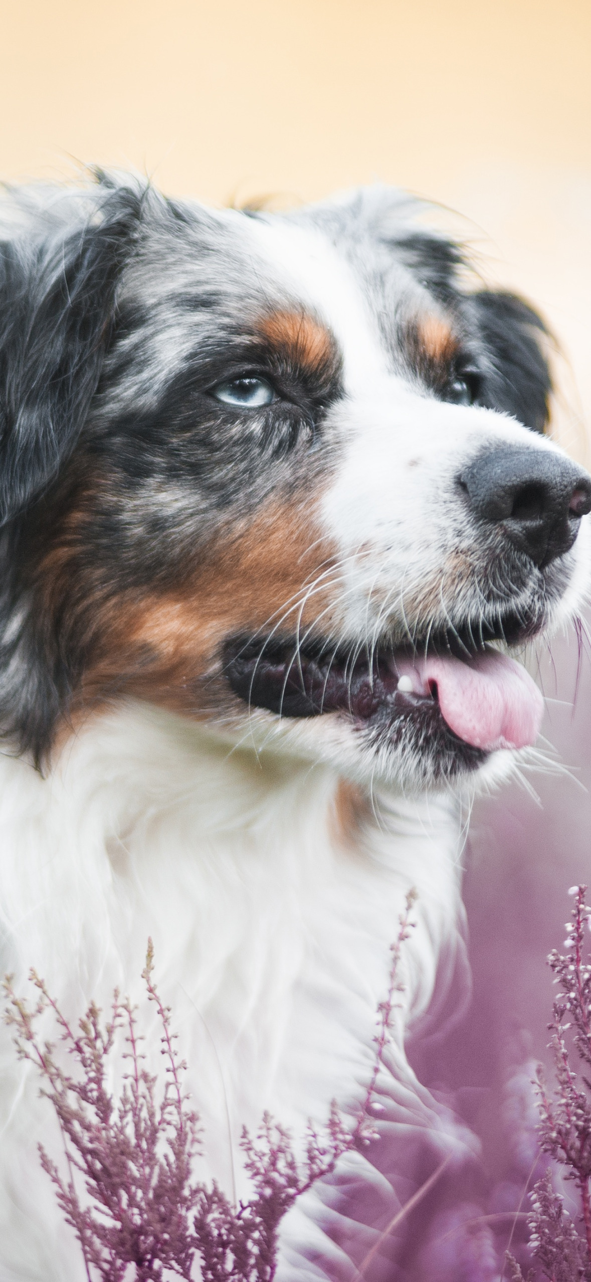 Назад к обои язык, морда, собака, боке, Австралийская овчарка, вереск, Аусси