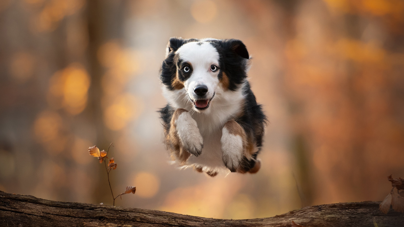 Назад к обои прыжок, собака, бревно, боке, Миниатюрная австралийская овчарка, Мини Аусси