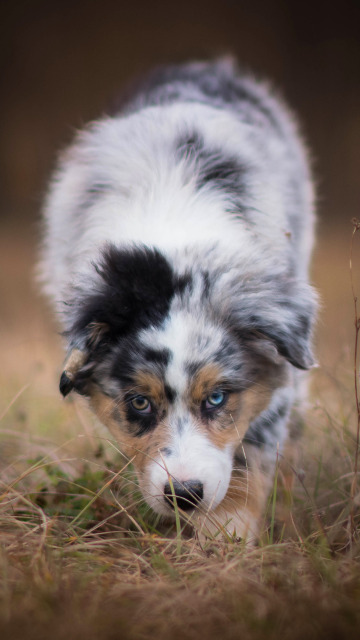 Назад к обои осень, лес, собака, щенок, прогулка, пятнистый, Австралийская овчарка, былинка
