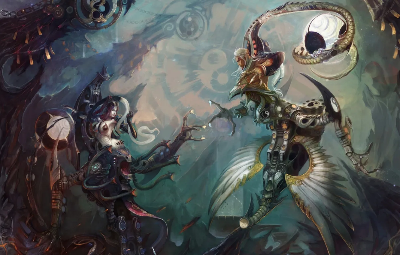 Девушка, крылья, противостояние, лапы, арт, битва, парень, сфера обои на телефон (фото, картинки)
