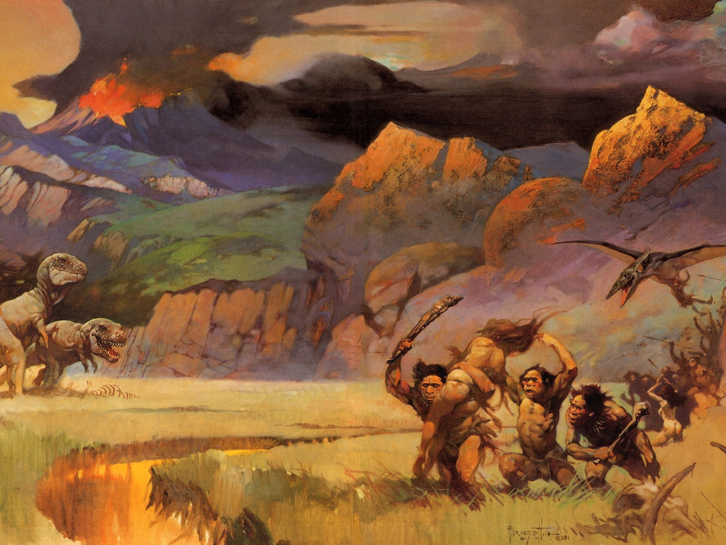 Назад к обои горы, женщина, человек, динозавр, fantasy, woman, art, Vulcano