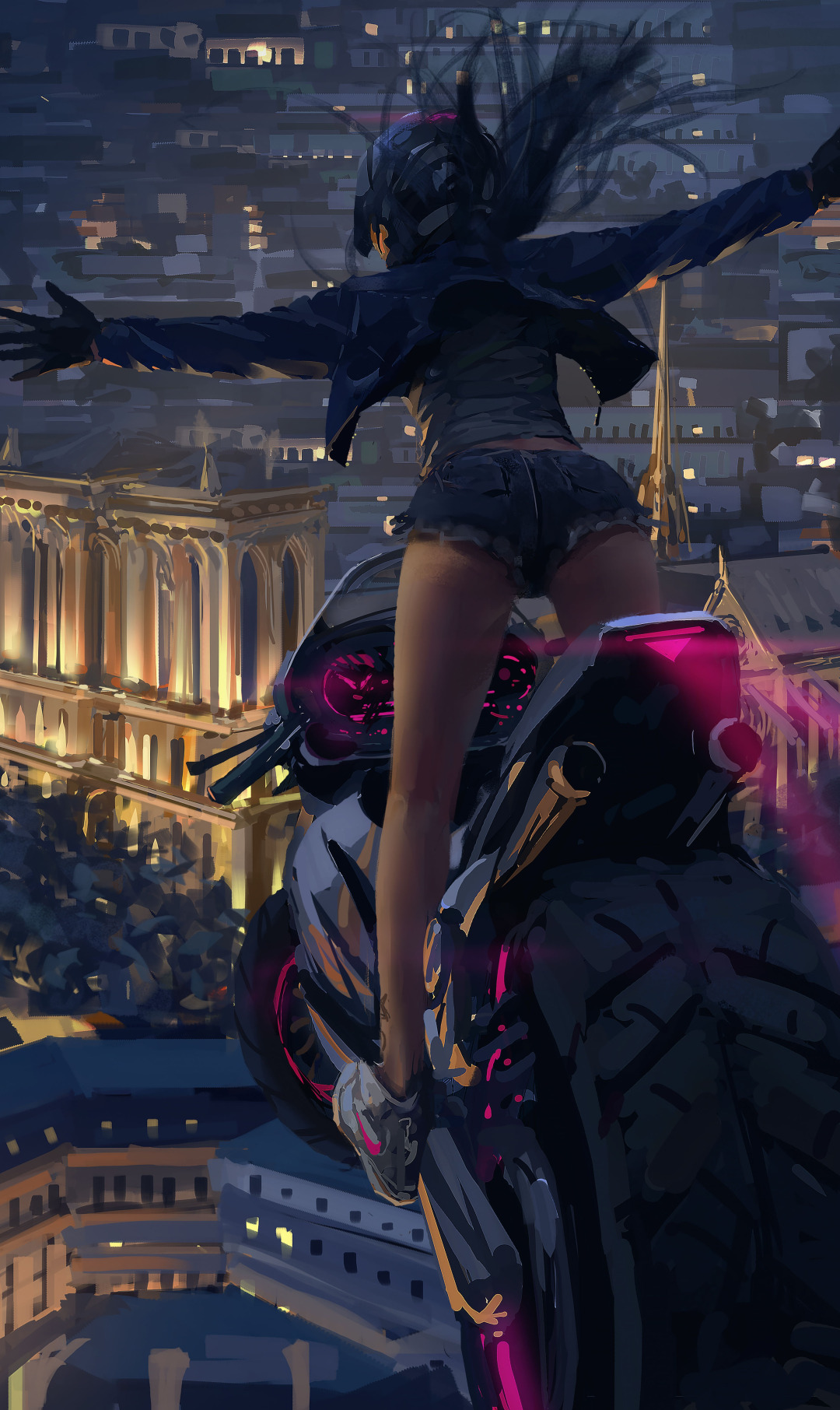 Назад к обои девушка, полет, город, дома, мотоцикл, сзади, Wlop, by Wlop