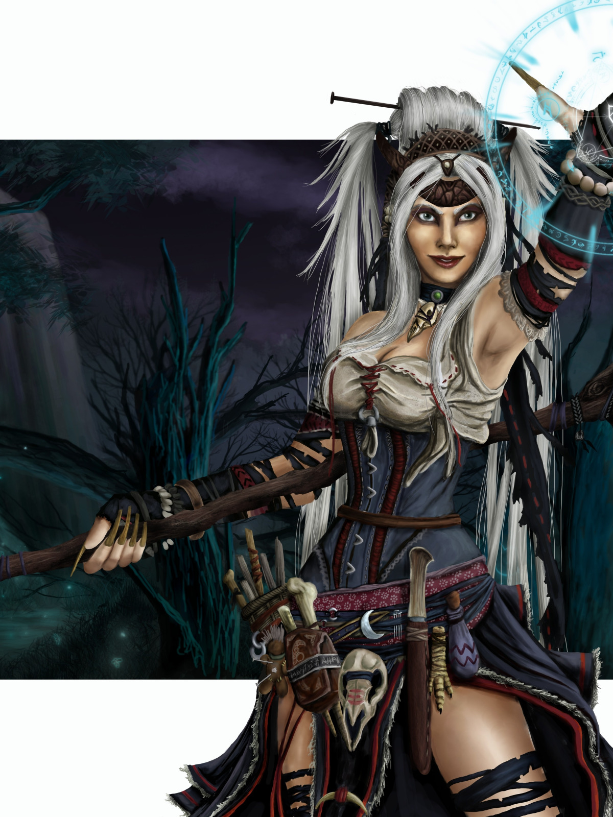 лес, взгляд, девушка, поза, оружие, фон, магия, одежда