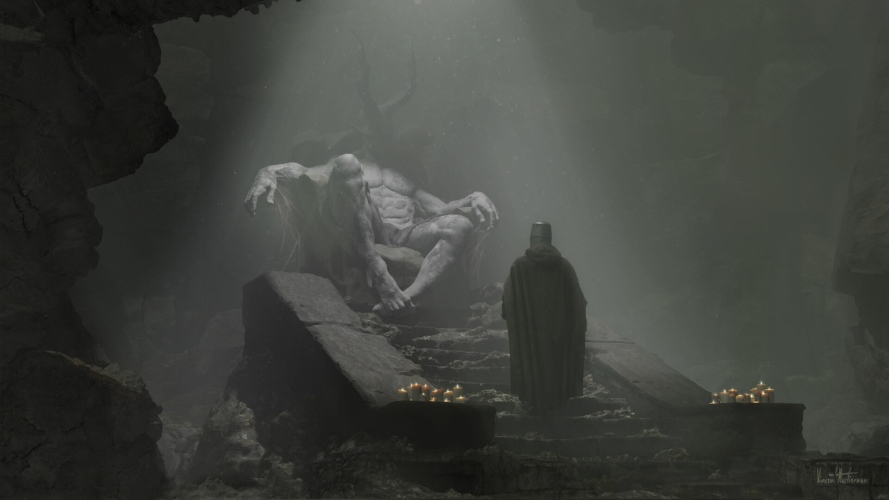 монстр, дьявол, подземелье, рогатый бог, черный плащ, мускулатура, проклятое место, рыцарь в шлеме