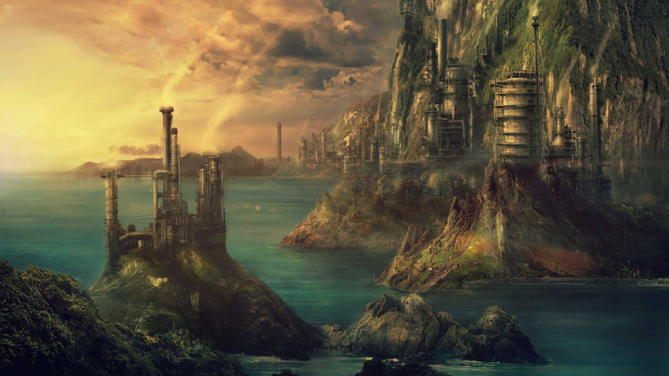 Назад к обои море, пейзаж, город, здания, фэнтези, арт, стимпанк, fantasy