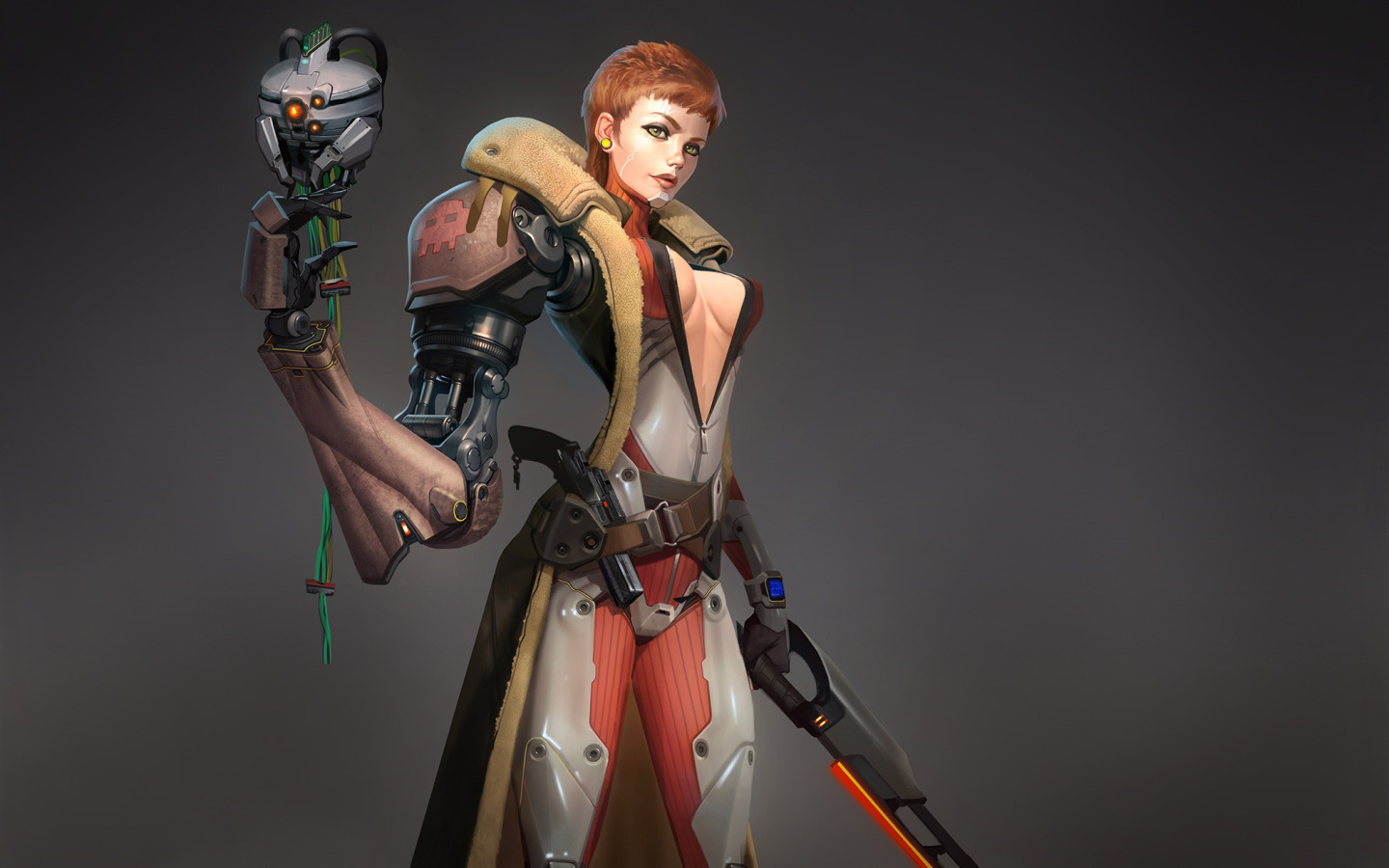 Назад к обои девушка, пистолет, минимализм, пират, костюм, серый фон, протез, сабля